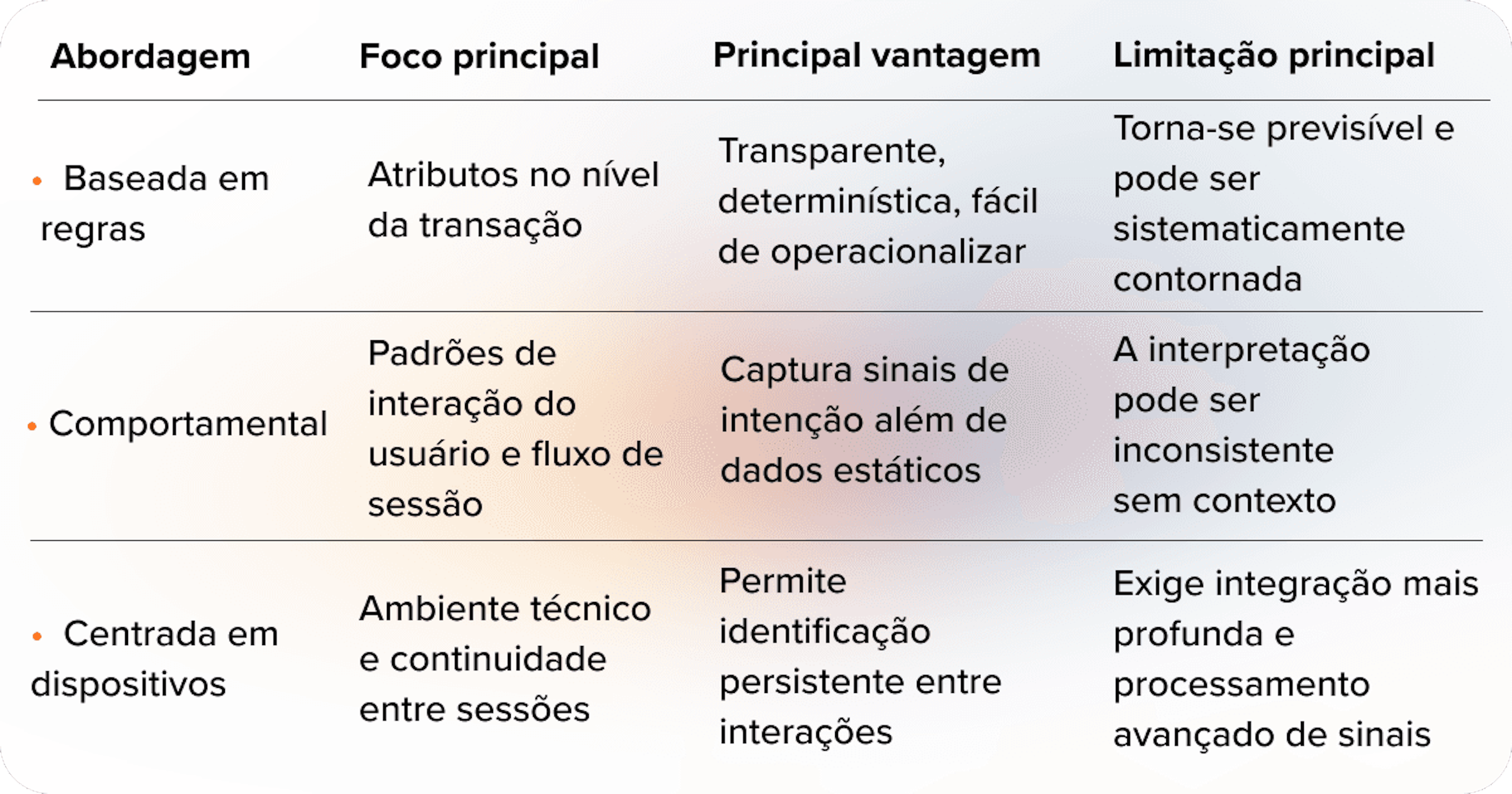 A diferença entre essas abordagens é estrutural. A detecção baseada em regras reage a condições predefinidas. A análise comportamental interpreta ações. A inteligência de dispositivos conecta eventos ao longo do tempo e entre diferentes ambientes.